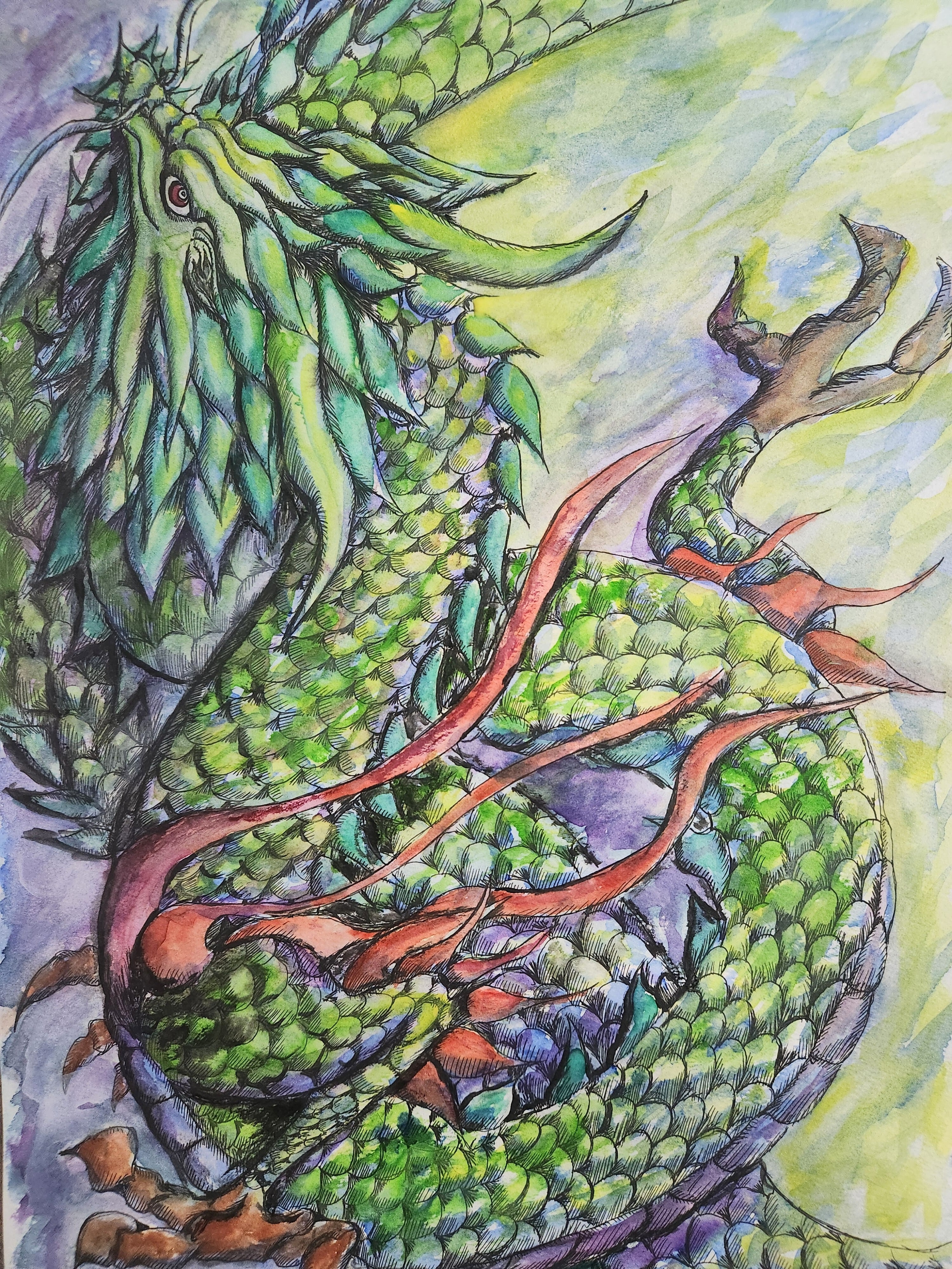 優しい青龍の癒し 【一点制作 原画】 本作は一点のみの制作です。 同じ構図・同じ意図での再制作はいたしません。 静かな清流のように、 心をやわらかく整える龍をイメージして描きました。 線を丁寧に重ね、透明水彩で流れを表現し、 最後に金彩で光を散りばめています。 空間にそっと飾ることで、 慌ただしい日常の中に、 一瞬でも深呼吸できる時間が生まれますように。 サイズ:A4 原画一点もの 表面コーティング済み 額装してお届けいたします あなたの空間に、静かな流れが宿りますように。 Yukiryu(雪龍)