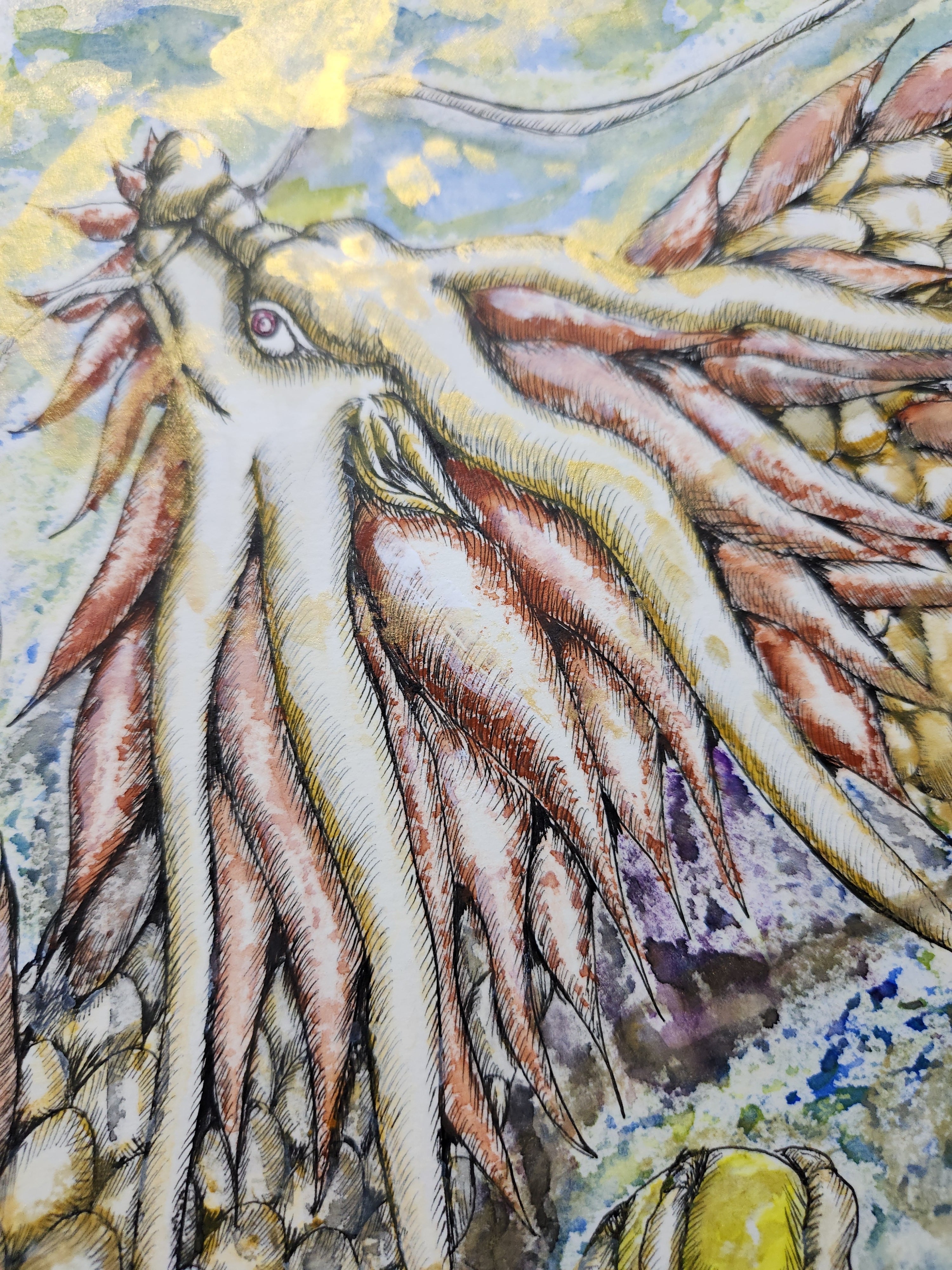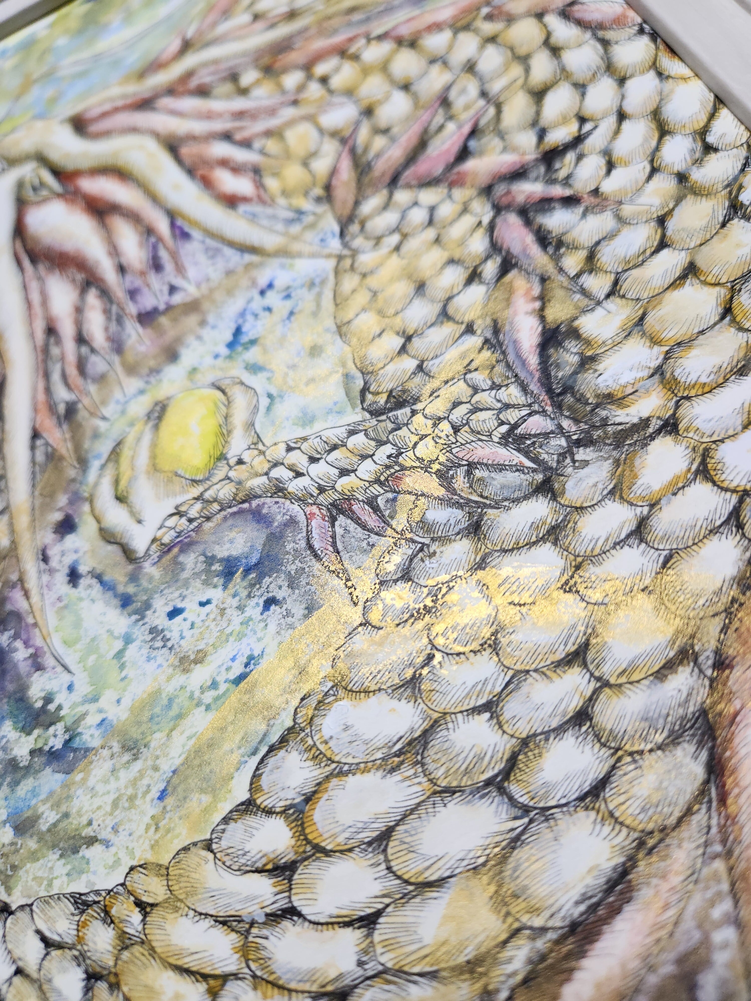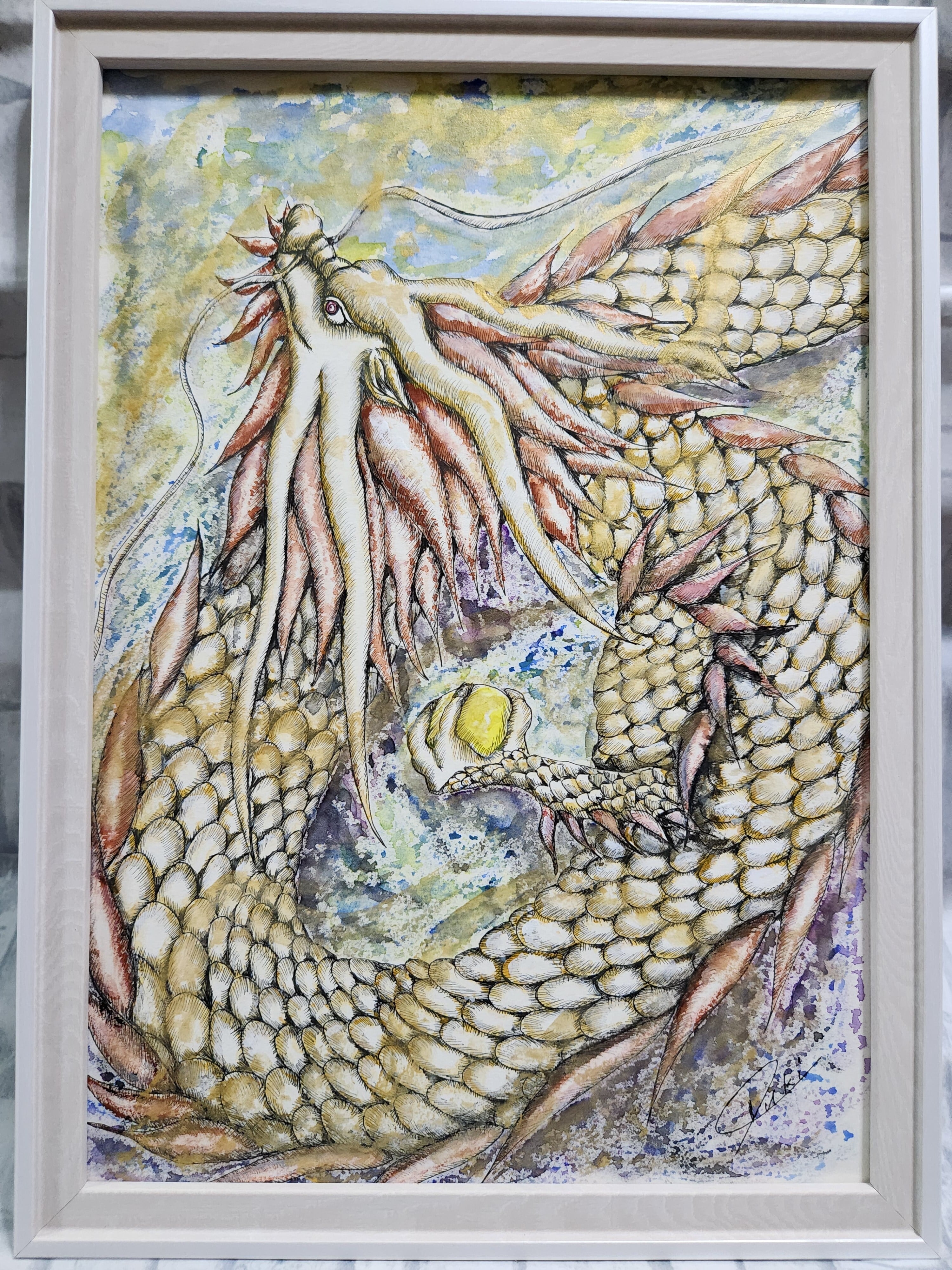 光を象徴する白龍をイメージし、心に安らぎをもたらす作品として描きました。透明水彩で、柔らかな光の流れと優雅な姿を表現し、金彩でその神秘的な輝きを添えています。